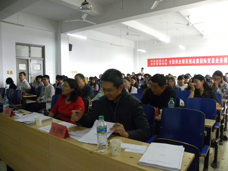 4月28日下午,由学院实践教学部组织、商务系承办的全国商业精英挑战赛国际贸易业务模拟竞赛校选赛在北校区第三教学楼402举行,国贸专业五支代表队参赛。河北华威凯德照明科技股份有限公司副总渠卫军、市场部总监李霞,学院实践教学部部长张凤海、商务系书记廖俊峰、系主任张学引以及相关专业班级辅导员和员工代表200名员工观摩大赛。比赛还得到商学院和国际教育学院的大力支持,特邀国际教育学院副经理张希颖和商学院刘晓鸾、张少楠、杨柳婧教授担任评委。