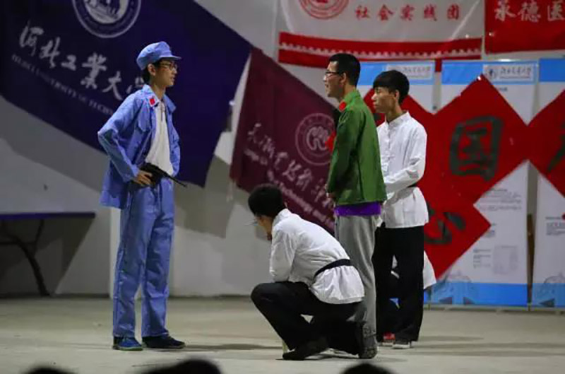 出征仪式后,社会实践师生们赴河北雄安白洋淀、清苑冉庄、易县狼牙山、阜平城南庄,以“传承·融合·拓展”为主题,以红色体验式主题教育为主线,以“红白黄绿银橙蓝——七彩颜色”为活动内容,在红色体验式主题教育、医疗志愿服务、农业推广调研、环保节能实践、科技体验宣传、爱心支教服务、京津冀高校融合等方面,联合开展社会实践。在太行山纪念馆,师生们为新时期共产党人的楷模、知识分子的优秀代表、太行山上的新愚公李保国教授的事迹所感动;在冉庄地道战遗址,师生在四通八达的地道中体验抗战军民的勇敢智慧;在水上神兵——雁翎队曾战斗过的白洋淀,实践队员们模拟抗日战争的三大战役,冒雨进行了一场特殊意义的定向越野;在狼牙山,陡峭、漫长的徒步登顶后,队员们庄严的宣誓气贯云霄、响彻山谷;在新中国的基石城南庄镇,实践团中师生党员师生们参观了晋察冀边区革命纪念馆,并怀着深深的敬仰集体重温了入党誓词。