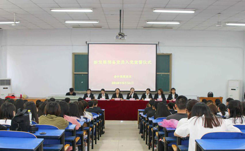 2018年5月11日下午,会计系党总支在西校区召开了预备党员宣誓大会,出席此次大会的有学院组织部部长陈玲、会计系党总支书记蔡杨、会计系党总支委员王慧霞、张艳敏、邓怀宇和樊璠,同时参加会议的有57位新发展员工党员以及本学期确定的入党积极分子和发展对象共计150人列席了会议,会议由总支委员孙韦主持。